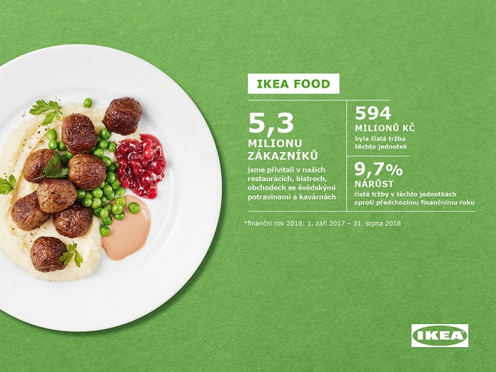 Celkem 594 milionů Kč byly čisté tržby z Ikea restaurace, bistra a obchůdků se švédskými specialitami – zaznamenaly nárůst 9,7 %. Za rok obslouží 5,3 milionu zákazníků a hitem jsou stále masové kuličky, ročně se jich prodá 1,5 milionu, a hot dogy, jichž se sní 1,3 milionu. Od srpna je pak v prodeji vegetariánský hot dog, jehož se jen za první měsíc prodalo 19 tisíc kusů.