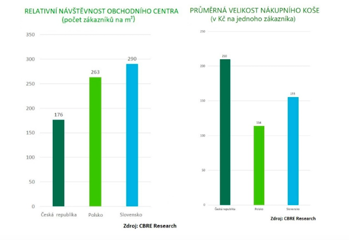 Zatímco Češi navštěvují nákupní centra v regionu nejméně často, utrácejí nejvíce, což koreluje s jejich kupní silou – za jednu návštěvu činí útrata přibližně 210 korun na osobu (pro srovnání na Slovensku je to 155 korun a v Polsku 114 korun na návštěvníka).