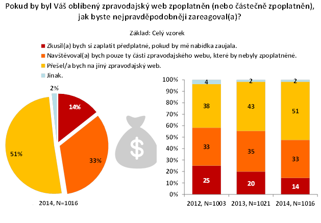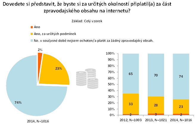 Srovnáním dat ze studií za poslední tři roky vyplývá, že v české internetové populaci mírně ubývá uživatelů, kteří si dokážou představit, že by si za obsah na internetu, nebo jeho část zaplatili. Zatímco v roce 2012 odpovědělo na tuto otázku kladně 33 % uživatelů, o dva roky později to bylo jen 23 %. Naopak se zvyšuje počet uživatelů, kteří nejsou ochotni platit za žádný zpravodajský obsah. Podle studie z roku 2014 jich bylo 74 %.