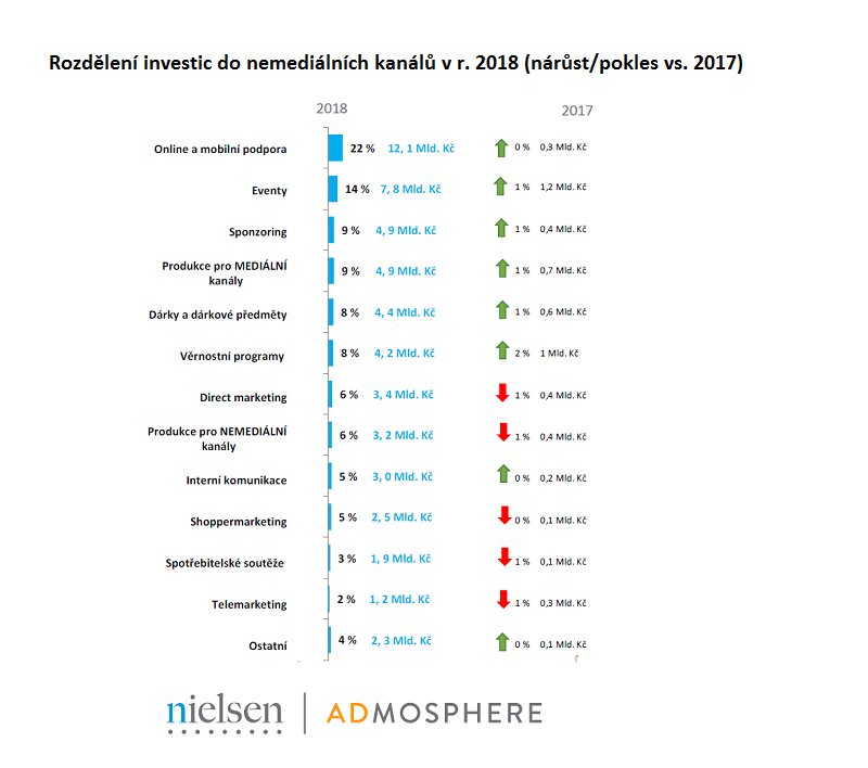 Podle průzkumu směřuje mírná většina investic (51 %) do mediálních kanálů, konkrétně 57,7 mld. korun. V rámci nemediálních kanálů putuje nejvíce prostředků do online a mobilní podpory (22 %). Oproti loňsku firmy plánují více investovat i do svých eventů (14%), a to o 1,2 mld. korun více. Výrazný nárůst v hodnotě miliardy korun se předpokládá také u věrnostních programů. Naopak méně peněz půjde do direct marketingu, produkce pro nemediální kanály či telemarketingu.