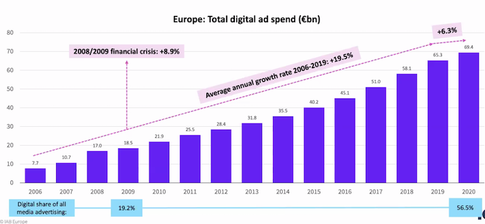 Objem digitální reklamy v loňském roce se na evropském trhu meziročně zvýšil o 6,3 % a dosáhl 69,4 miliard euro. Vyplývá to z aktuální studie IAB Europe: Adex Benchamrk Study 2020, která byla představena v úterý odpoledne. Podle hlavního ekonoma IAB Europe Daniela Knapa byl vývoj v loňském roce nakonec lepší, než naznačovaly první odhady z jara 2020, kdy byl digitální reklamě předpovídám až 12% pokles. Už v loňském létě se směr začal obracet a trh nakonec dospěl až k 6% růstu, přestože šlo o nejslabší růst v uplynulých letech (viz graf). Do internetové reklamy vstoupili noví hráči a trh se velmi rychle zotavil.