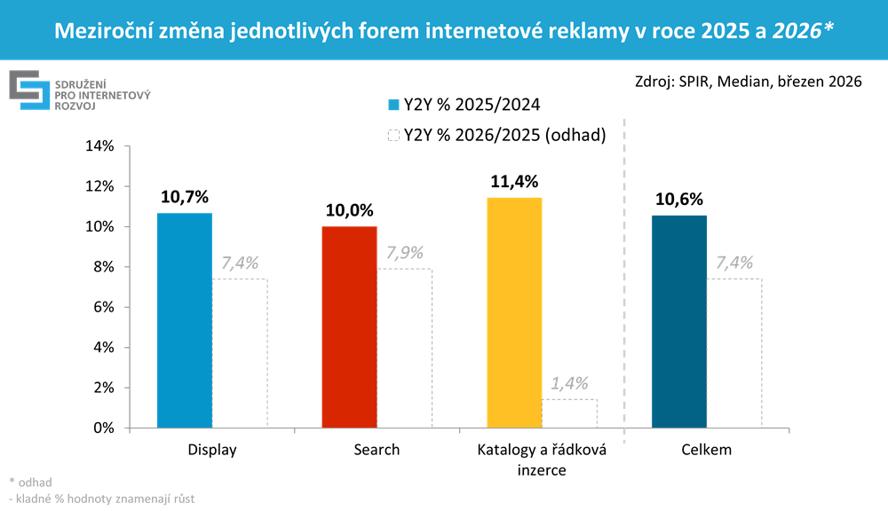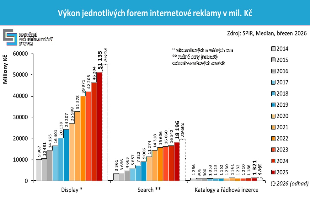 Online reklama v roce 2025 dosáhla téměř 71 miliard korun, což představuje meziroční nárůst o 10,6 %. Rostly všechny formy online reklamy – display reklama (+10,7 %), reklama ve vyhledávání (+10 %) i katalogy a řádková inzerce (+11,4 %). Odhad růstu pro rok 2026 je 7,4 %. Vyplývá to výzkumu inzertních výkonů internetové reklamy, který pro Sdružení pro internetový rozvoj (SPIR) realizuje agentura Median.