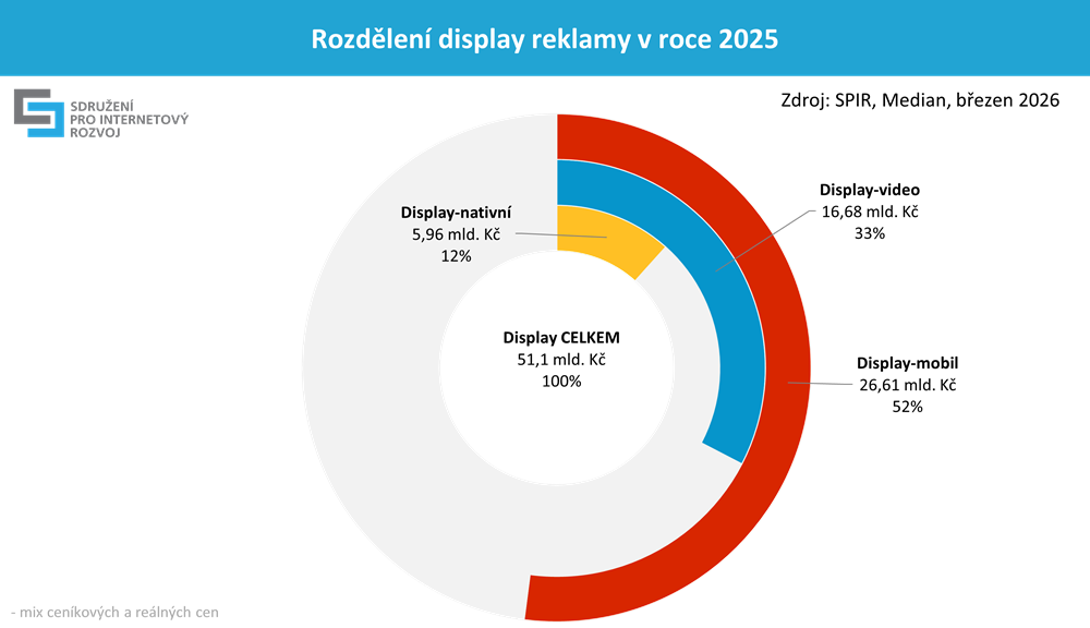 Největší část investic směřovala i v roce 2025 do celoplošné (display) reklamy, která dosáhla objemu 51,1 miliardy Kč v kombinovaných cenách. Tento formát zahrnuje jak reklamu v obsahových sítích (např. Seznam Sklik, Google Ads nebo Facebook), tak RTB a nativní formáty. Více než polovina (52 %) výdajů z displaye připadá na displayovou reklamu na mobilních telefonech a třetina (33 %) na video. Nativní reklama představuje 12 % z výdajů směřovaných do display reklamy.