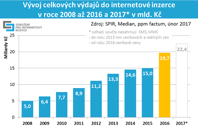 Objem internetové inzerce dosáhl v loňském roce téměř 20 miliard korun v ceníkových cenách. Oproti roku 2015 jde o 31% nárůst, který je způsoben především zvýšenými investicemi do reklamy ve vyhledávání, v obsahových sítích a nákupem inzertního prostoru formou RTB. Vyplývá to z průzkumu inzertního výkonu internetové reklamy, který pro Sdružení pro internetový rozvoj (SPIR) realizuje agentura Median.