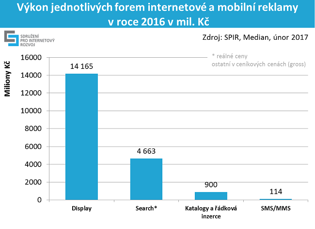 Největší část internetových inzertních výdajů připadá na celoplošnou (display) reklamu (14,2 mld. Kč). Letos poprvé je použita nová struktura výsledků, kdy je do display reklamy započítána i reklama v obsahových sítích (zejména sítě Seznam Sklik, Google AdWords a Facebook), RTB způsobem obchodovaná reklama a nativní reklama. Po display je druhou nejpoužívanější formou reklama ve vyhledávání, do které investovali inzerenti 4,7 mld. Kč v reálných cenách. Pro katalogy a řádkovou inzerci média deklarovala tržby 900 mil. Kč v ceníkových cenách. Za SMS a MMS kampaně, které nezapočítáváme do celkového výkonu internetové inzerce, zadavatelé reklamy zaplatili 114 mil. Kč v ceníkových cenách.