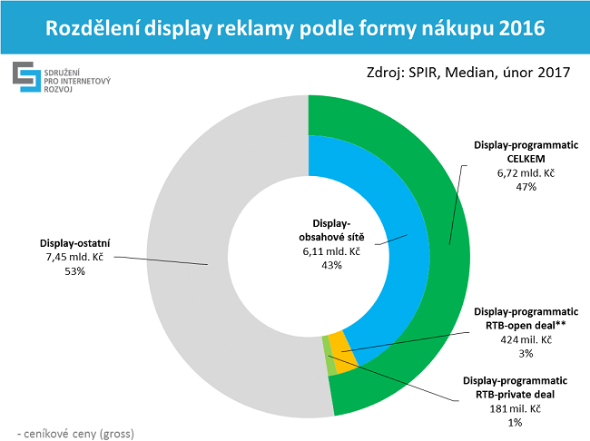 Z celkových inzertních výdajů do reklamy připadá na programmaticky obchodovanou třetinový podíl (34 %). Programaticky obchodovaná display reklama v roce 2016 v reálných cenách, pak dosáhla objemu 5,84 mld. Kč, z toho měly největší podíl (91 %) reklamní obsahové sítě (5,31 mld. Kč v reálných cenách). Na RTB způsob prodeje reklamy připadá 9% podíl s celkovým objemem 526 mil. Kč v reálných cenách.