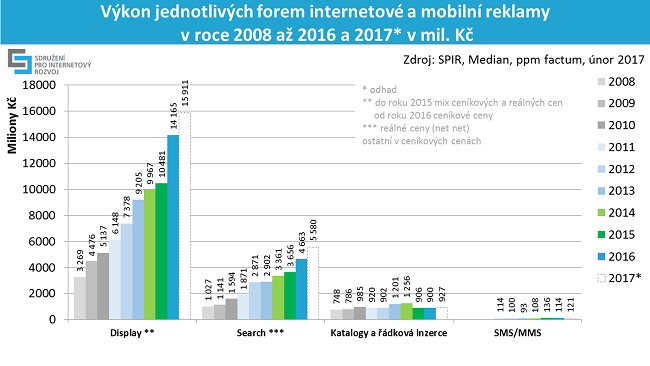 V letech 2008-2017 je dlouhodobý růst jasně patrný u display reklamy a reklamy ve vyhledávání. U display reklamy je růst způsoben zejména díky programaticky obchodovanému inzertnímu prostoru – reklamním obsahovým sítím a RTB typu prodeje – které byly navíc dopočteny z reálných cen na ceníkové ve výši +15 %