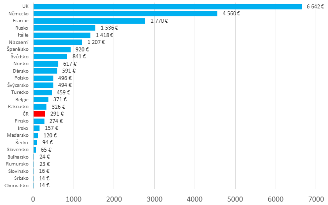 Z celkových 24,3 miliard euro, které byly loni investovány do internetové reklamy v Evropě, připadá na Českou republiku 291 milionů (cca 7,3 mld. korun), což je přibližně stejná částka, jako v sousedním Rakousku nebo ve Finsku či Belgii. Celková výše inzertních výdajů na online se mezi jednotlivými zeměmi velmi liší. Největší jsou trhy ve Velké Británii, Německu a Francii, kde se investice pohybují v řádech miliard euro, nejméně peněz jde na internetovou reklamu v jihovýchodních zemích Evropy (desítky milionů euro). Údaje pocházejí z mezinárodní studie AdEx 2012 monitorující inzertní výdaje v 26 evropských státech.