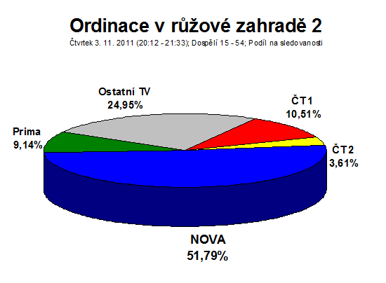 Čtvrteční díl seriálu TV Nova Ordinace v růžové zahradě sledovalo ve skupině diváků starších 15 let 2,082 mil. diváků. To v této cílové skupině představovalo podíl na sledovanosti 51,74 % (ve skupině 15-54 51,79 %). Ordinace tak v době svého vysílání dominovala čtvrteční večerní nabídce televizních stanic.