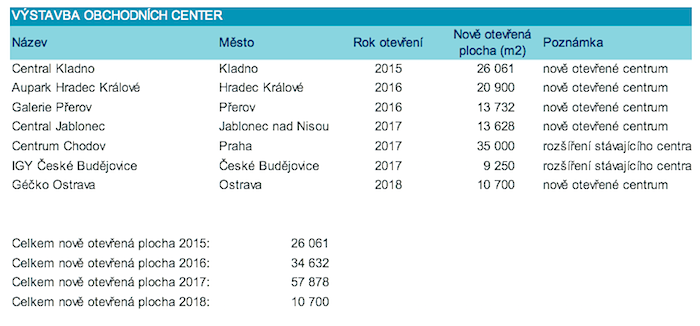 V letošním roce přibylo na českém trhu 57 850 m2 nových ploch obchodních center. Číslo zahrnuje rozšíření centra IGY České Budějovice o 9 250 m2, rozšíření centra Chodov o 35 000 m2 a výstavbu zcela nového obchodního centra Central Jablonec o výměře 13 600 m2. Oproti loňskému roku se jedná o 67% nárůst. V příštím roce však trh doručí výrazně méně nových ploch obchodních center. Podle aktuálních informací se dokončí jen jediné obchodní centrum Géčko Ostrava. Naopak po roce 2019 dojde k otevření hned několika projektů.