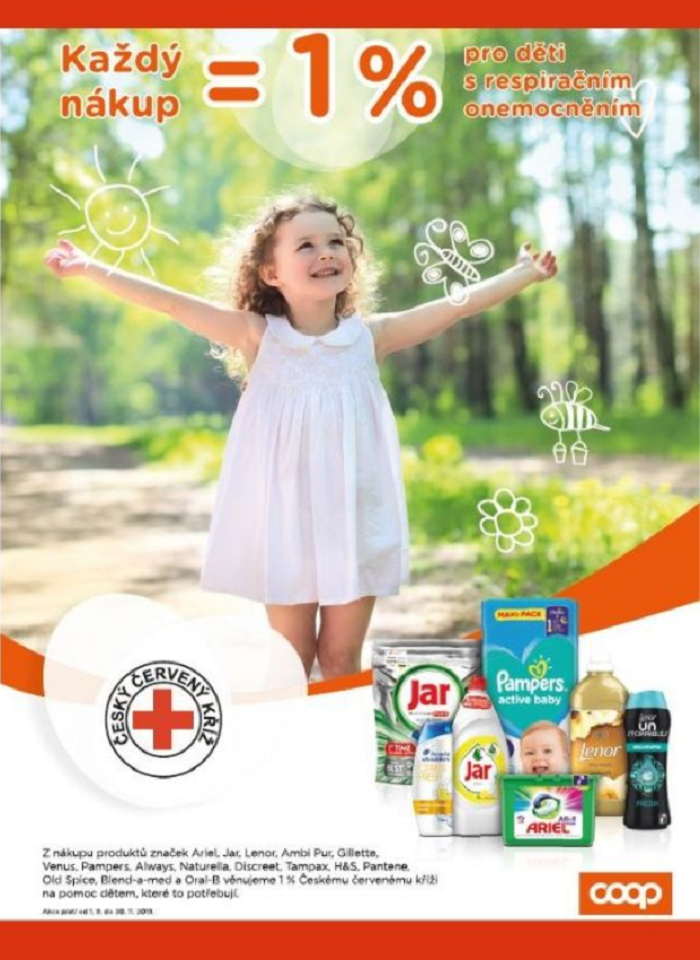 Již popáté opakuje společnost Procter & Gamble akci, v níž odevzdává 1 % z prodeje svých výrobků na charitativní účely Českému červenému kříži (ČČK). Letos se již třetí rok za sebou spojuje s prodejní sítí COOP. Od začátku září do konce listopadu bude vybírat peníze za nákup produktů značky Ariel, Lenor, Jar, Ambipur, Gilette, Venus, Pampers, Always, Naturella, Discreet, Tampax, Head & Shoulders, Pantene, Old Spice, Blend-a-Med a Oral-B. Výtěžek bude tentokrát věnován na lékařské vybavení Dětské odborné léčebny Charlotty G. Masarykové v Bukovanech.