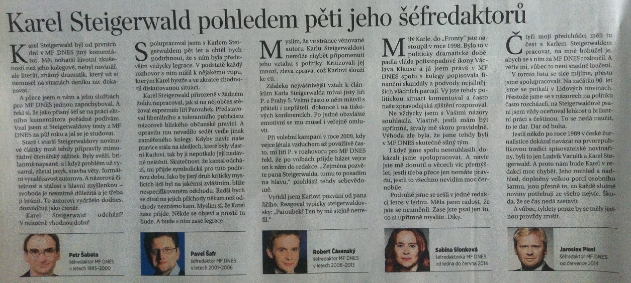 Páteční vydání MF Dnes se loučí s dlouholetým komentátorem Karlem Steigerwaldem, který po 16 letech z deníku odchází. V rubrice Názory otiskuje jeho text „Vždy nám bylo lépe dřív než potom“ z 26. ledna 2002.