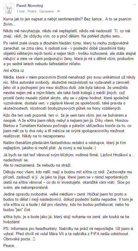 Pavel Novotný, tvář serveru eXtra.cz, oznámil na Facebooku svůj odchod.