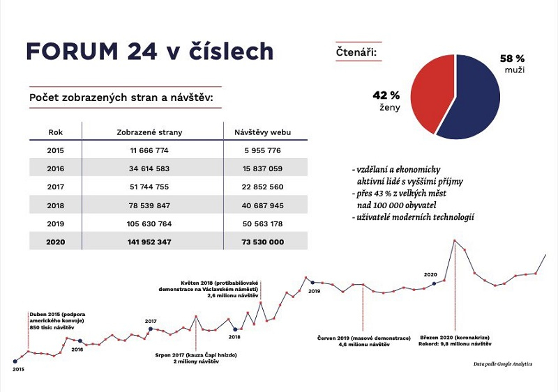 Průměrná měsíční návštěvnost webu Forum 24 dosáhla v loňském roce 1,4 mil. reálných uživatelů a ve srovnání s rokem 2019 se zvýšila o 32 %. Vyplývá to z dat jednotného měření internetové návštěvnosti NetMonitor. I v loňském roce tak web pokračoval ve zvyšování své návštěvnosti.