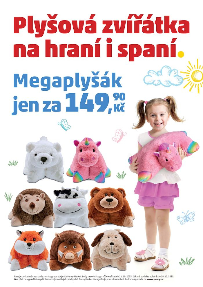Stačí nakoupit v Penny a za každých 200 korun nákupu v Penny dostane zákazník jeden bod. Za 10 bodů nasbíraných ve sběratelské kartičce pak bude možné zakoupit vybraného plyšáka za zvýhodněnou cenu 149,90 Kč. Lze jej, samozřejmě, pořídit i bez bodů, a to za plnou cenu 399,90 korun. Tato věrnostní akce potrvá od 10. srpna do 11. října a body bude možné uplatnit o týden déle, tedy až do 18. října. Akce platí do vyprodání zásob v jednotlivých prodejnách Penny po celé republice.