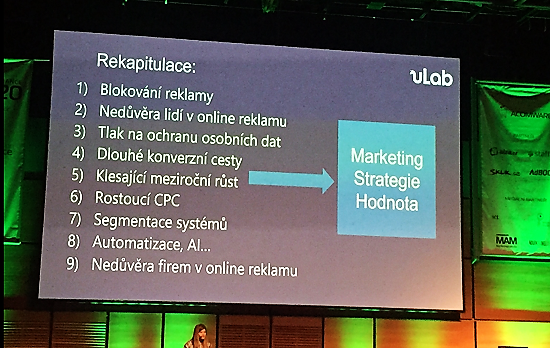 S upřímným pohledem na současný stav PPC odvětví vystoupila Markéta Kabátová, zakladatelka uLab. Za otazníky, které i do budoucna mohou ovlivňovat úroveň výkonnostních kampaní, označila několik trendů, mezi nimi např. blokování reklamy nebo nedůvěru lidí i firem v internetovou reklamu. S odkazem na existující výzkumy uvedla, že mobilní reklamě důvěřuje jen 39 % lidí. „To ovlivňuje výkonnost našich kampaní a podepisuje se na tom, že lidé nejsou spokojení. To pak vzbuzuje zájem státních institucí internet regulovat,“ zmínila s odkazem na nové evropské direktivy o ochraně osobních údajů GDPR a ePrivacy.
