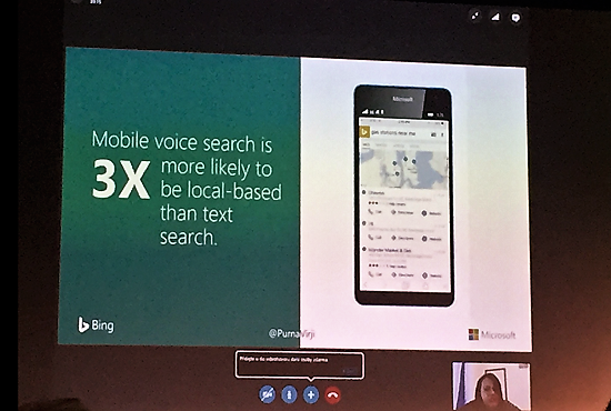 Trendem ovládání hlasem se zabývala Purna Virji z Microsoftu. S postupně zlepšující se technologií rozpoznávání hlasů se zvyšuje i množství hlasového vyhledávání na mobilních telefonech. V současnosti tak probíhá už 20 % mobilního vyhledávání. Podle odhadu společnosti Gartner bude do roku 2020 až 30 % vyhledávání na webu probíhat mimo obrazovky.