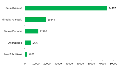 Ve sledovaném období od 4. do 20. října získal největší počet fanoušků Miroslav Kalousek (více než 5100), na druhém místě skončil Tomio Okamura (více než 4400). Andrej Babiš získal více než 1400 fanoušků, Jana Bobošíková pouze 16 a Přemysl Sobotka dokonce 29 fanoušků ztratil.