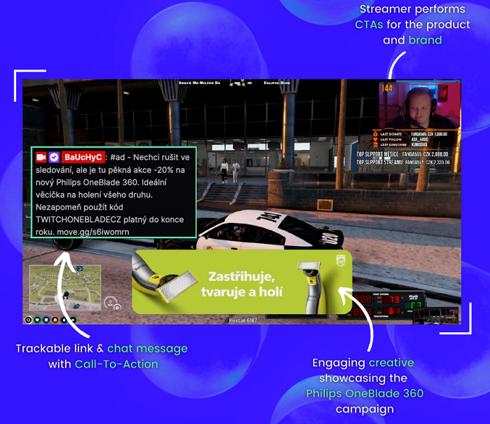 Philips se rozhodl využít služby Adlab od firmy Cavea, aby efektivně zacílil svou kampaň na mladé a zejména mužské publikum. Z následného briefu bylo zvoleno 27 streamerů, kteří vytvořili mix pro relevantní, ale zároveň dostatečně diverzifikované publikum na Twitchi, který globálně eviduje 78 % mužské zastoupení ve věku do 35 let. Philips také poskytl grafické podklady a Cavea připravila kreativní 20vteřinový vizuál, který běžel v hodinové frekvenci na gaming live streamech vybraných mikroinfluencerů. Zpětná vazba od streamerů zúčastněných v kampani byla velmi pozitivní. Většina z nich zároveň dobrovolně podporovala reklamu v podobě zmínek či vybídnutí jejich sledujících k prohlédnutí produktu pod odkazem v live chatu, což ve výsledku zajistilo nadprůměrné CTR a množství prokliků. „Spokojenost ze strany klienta dokazuje následné prodloužení kampaně mezi březnem až červnem 2023, kde zároveň probíhají i různé aktivity v podobě product placementu,“ uvedl Ondřej Suchý, Business Development Manager Cavea.