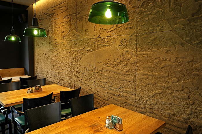 Stěny interiéru zdobí reliéfy nejtypičtějších míst plzeňského pivovaru, návštěvníci se tak mohou cítit jako na varně, ve sklepě mezi obřími sudy či před branou plzeňského pivovaru. Motivy a jejich provedení jsou autorským dílem sochařského ateliéru Mergental & Kovařík.