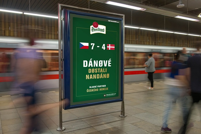 Průběžné informace z vývoje hokejových zápasů přináší Pilsner Urquell, oficiální partner českého hokeje, na digitálních plochách CLV společnosti MetroZoom v pražském metru.