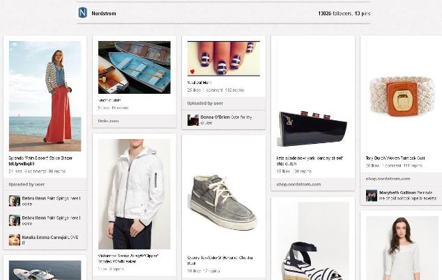 Pinterest představuje velmi dobré místo zejména k vizuální propagaci značky. Umožňuje nahrávat propagační fotografie ve vysoké kvalitě, a vytvářet tak atraktivně vyhlížející produktové katalogy. Pěkným příkladem je nástěnka amerického obchodu s oblečením a doplňky Nordstrom.