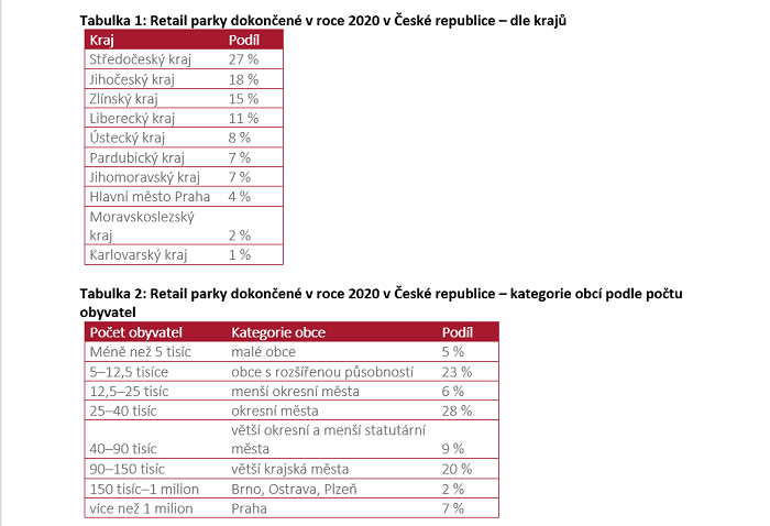 Největším loni otevřeným je RP Kolín Ovčáry s plochou 7500 m² (bez započtení plochy supermarketu). Právě ve Středočeském kraji se loni retail parků vystavělo nejvíce – přes čtvrtinu celkové loni vzniklé plochy. Retail parky loni vznikaly v kategorii obcí od 5 do 12,5 tisíce obyvatel, nejčastěji pak v okresních městech s 25 až 40 tisíci obyvatel.