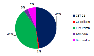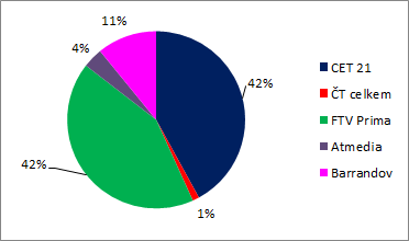 Podíl reklamních bodů, tzv. TRPs, na které se nakupuje televizní reklama, byl v letošním lednu v cílové skupině starší 15 let vyrovnanější než na konci loňského roku. Obě hlavní skupiny CET 21 a FTV Prima dosáhly shodného podílu 42 %. V mladší skupině 15-54 dosahuje nejvyššího podílu CET 21 (47 %).