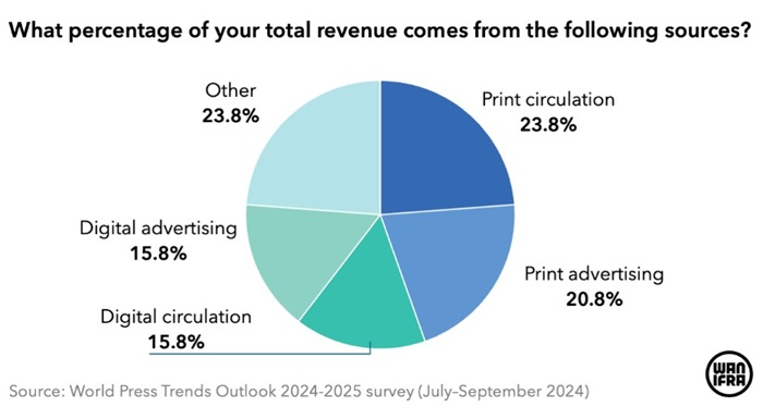 Závislost vydavatelského novinového sektoru na výnosech z tištěných edicí se snižuje. Podle letošní zprávy WAN-IFRA s názvem World Press Trends Outlook 2024-2025, která mapuje vývoj v novinovém odvětví napříč různými světovými zeměmi za poslední rok a naznačuje výhled do budoucna, klesl podíl výnosů z tisku pod polovinu celkových výnosů vydavatelů. Naopak digitální výnosy a alternativní zdroje financování nabývají na významu.
