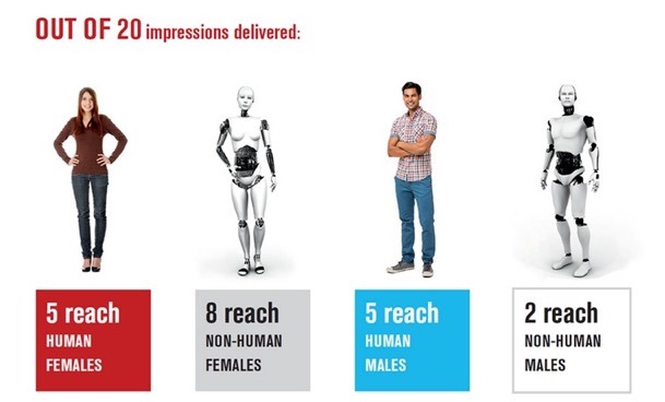Přiložený obrázek ukazuje jaká je průměrná skladba lidí a robotů z každých 20 doručených impresí podle comScore.