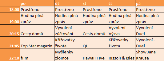 Novinkou je přesun společenského magazínu Top Star magazín ze středy do pondělního večerního vysílání (od 21:45). Pořad bude mít také novou moderátorku – Ivu Kubelkovou.