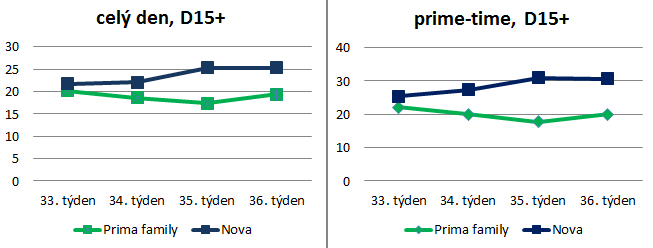 Nasazování nových pořadů Prima family se v minulém týdnu projevilo zvýšením týdenního podílu stanice ve srovnání s předcházejícím týdnem (35. týden), a to o 2 procentní body. TV Nova si v minulém týdnu udržela svůj podíl z předešlého týdne, ve kterém konkurenci utekla. Nůžky mezi oběma hlavními komerčními stanicemi se tak po skončení letních schémat, kdy se zejména v 15+ přibližovaly, otevřely na začátku podzimu víc na stranu TV Nova.