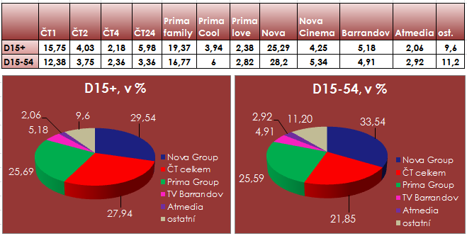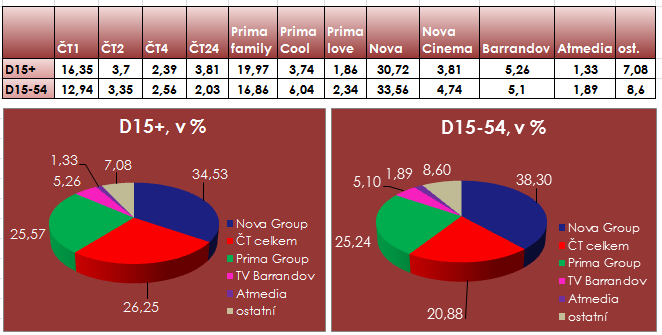 Přestože podzimní programy ještě zdaleka nejsou v plném běhu a jejich výkony se ukáží teprve v následujících týdnech, začátek podzimní sezóny přinesl několik zjištění. I v minulém 36. týdnu (týden od 3.9. 2012) byla nejsilnější televizní skupina Nova, a to v obou cílových skupinách, přičemž mezi diváky 15-54 je její odstup větší než v obecné populaci 15+. K hlavním programovým pilířům podvečerní Ulici, zpravodajským Televizním novinám a seriálu Ordinace v růžové zahradě se přidal i nový seriál Gympl s (r)učením omezeným, což Nově vytvořilo silný prime-time zejména ve všední dny.