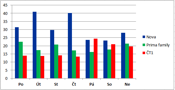 Z pohledu jednotlivých vysílacích dnů jsou komerční televize úspěšnější v pracovních dnech (především pondělí až čtvrtek), naopak víkendy (zejména pátek a sobota) vyznívají pro ČT1.