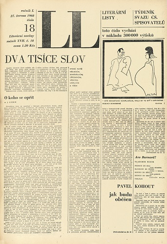 „Lidové noviny vycházejí dnes v důsledku reorganizace periodického tisku naposledy. Svaz čs. spisovatelů bude od 9.2. vydávat Literární noviny, týdeník pro kulturněpolitické a umělecké otázky. Věříme, že všichni naši odběratelé zůstanou věrni i novému časopisu, který chce být propagátorem socialistické kultury a jako bojový orgán kulturních pracovníků stane se nezbytným informátorem a rádcem naší pracující inteligence“ A „nové“ Literárky byly na světě. Žádný odkaz na dlouholetou tradici, jen motto: „Vedeni krásným příkladem Litěraturnoj gazety, orgánu Svazu sovětských spisovatelů…“
