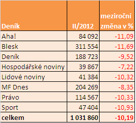 Nejnižší meziroční pokles je registrován u deníku Hospodářské noviny, naopak nejvyšší u bulvárních deníků Blesk a Aha!. U většiny deníků je ale meziroční pokles na úrovni 10 %.
