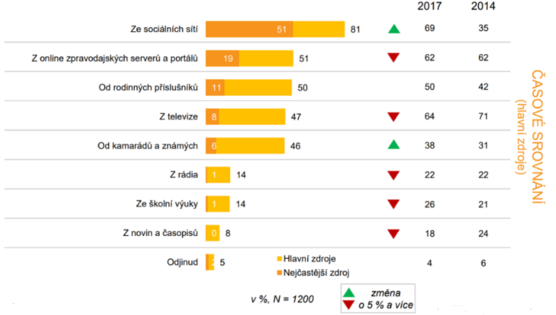 Od posledního měření v roce 2017 výrazně posílil informační význam sociálních sítí (o 12 %). Polovina studentů (51 %) deklarovala, že jde o nejčastější zdroj aktuálních společenských a politických témat, která je zajímají. Pro 81 % studentů jde o jeden z hlavních zdrojů. Naopak role školní výuky i tradičních médií (tisk, rozhlas) výrazně poklesla. Pouze 14 % studentů zahrnulo školu mezi své hlavní informačními zdroje a 1 % ji uvedlo jako svůj nejčastěji využívaný zdroj.