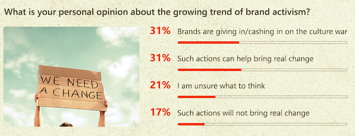 Aktivismus značek však podle zmíněného výzkumu vnímá 49 % spotřebitelů pozitivně, 17 % negativně a 34 % k němu zaujímá neutrální postoj. Necelá třetina (31 %) z více než 30 tisíc respondentů uvedla, že tyto aktivity značek jen přiživují kulturní rozbroje, stejný podíl dotázaných je však toho názoru, že by mohly přispět ke skutečné změně. Naopak 17 % se domnívá, že to moc velký dopad na změnu mít nebude a 21 % neví, co si o tom myslet.