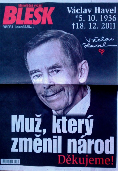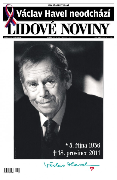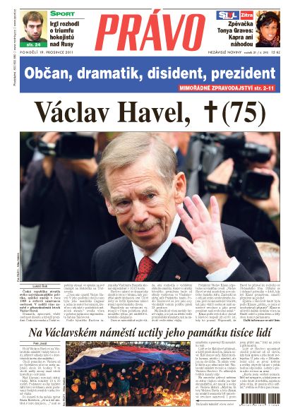 Deník Právo zvolil pro pondělní vydání barevnou fotografii a Václavu Havlovi věnoval mimořádně zpravodajství na svých prvních deseti stranách.