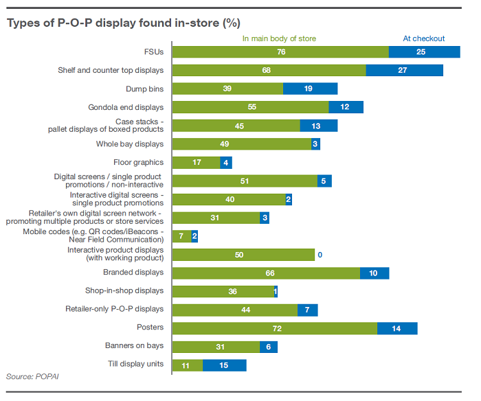 Postupuje-li zákazník dovnitř prodejny, může narazit až na 18 různých druhů POP médií. Nejrozšířenější jsou samostatné stojany (76 %), plakáty (72 %), komunikace na regálech a pultech (68 %). Ve většině obchodních domů a síťových prodejen se také objevují brandová permanentní vystavení, naopak menší zastoupení (41 %) má u nezávislých prodejců. Mezi další prostředky patří regálové čelo, interaktivní produktové displeje, interaktivní či neinteraktivní digitální obrazovky. Poslední tři jmenované se na českém trhu používají zřídka, na rozdíl od podlahové grafiky či QR kódů, které se zde používají hojně.