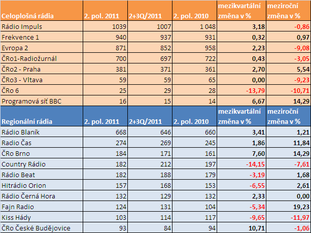 Oproti výsledkům z předcházejícího měřeného období (2. a 3. kvartál 2011) si právě Rádio Impuls polepšilo nejvíce ze všech celoplošných stanic. Pro celoplošné stanice přitom obecně platí, že jejich poslechovost byla v mezikvartálním porovnání stabilní (s výjimkou ČRo6). V meziročním srovnání je patrný nižší počet posluchačů Evropy 2.