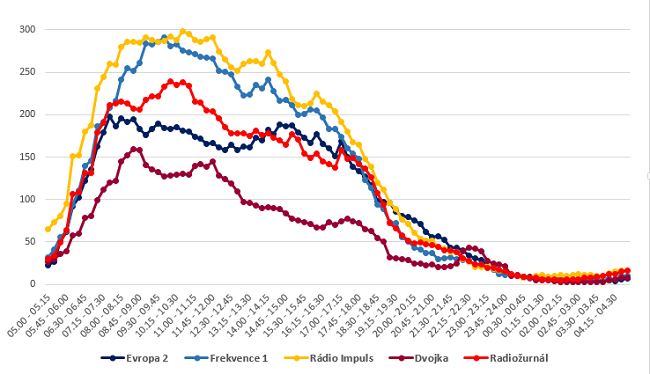 Po většinu dne je nejposlouchanější tuzemskou rádiovou stanicí Rádio Impuls, ukazuje denní čtvrthodinový profil nejposlouchanějších tuzemských celoplošných stanic. Přesto v určitých denních časech má Impuls konkurenci, kdy se mu některé stanice vyrovnávají, nebo ho dokonce mírně předbíhají.