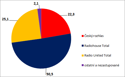 Nejsilnějším rádiovým zastupitelstvím zůstává Radiohouse total s celkovým podílem 50,5 % (-0,5 procentního bodu). Druhý nejsilnější komerční subjekt Radio United si polepšil o 1,3 procentního bodu na 25,1 %.