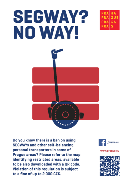 Praha omezuje v centru a dalších místech používání vozítek segway a jiných osobních samovyvažovacích přepravníků. Na zákaz upozorňuje zahraniční turisty kampaní v anglickém jazyce prostřednictvím reklamních ploch a letáků.
