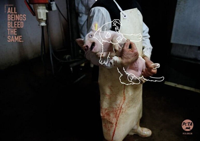 Pražská agentura DDB vytvořila mezinárodní kampaň pro neziskovou organizaci PETA, jež se věnuje boji za práva zvířat. Se sloganem „Všechna zvířata krvácí stejně“ upozorňuje na to, že stejně jako domácí mazlíčci trpí bolestí i zvířata na jatkách.