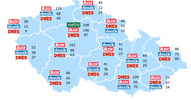 S výjimkou Prahy, kde je nejčtenější Metro, a Pardubického kraje, kde je nejčtenější Deník, zaujímá pozici nejčtenějšího ve všech zbývajících krajích deník Blesk.