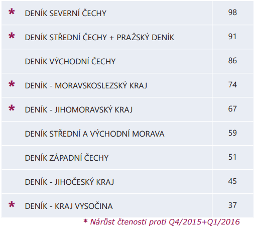 Souhrnná čtenost Deníku představovala v prvním pololetí 606 tisíc čtenářů, v mezikvartálním srovnání to představuje +2%, ve srovnání se stejným obdobím před rokem -4 %. Deník Střední Čechy a Pražský deník se posunul na pozici druhého nejsilnějšího v rámci čtenosti jednotlivých regionálních deníků.