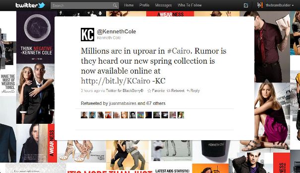 Napsat nesprávný tweet v nesprávný čas se podařilo i módní značce Kenneth Cole, když v době vypuknuvšího arabského jara v Egyptě tweetla: „Milióny lidí jsou v Káhiře pobouřeny. Hlavně proto, že se k nim doneslo, že naše jarní kolekce je nyní online.“