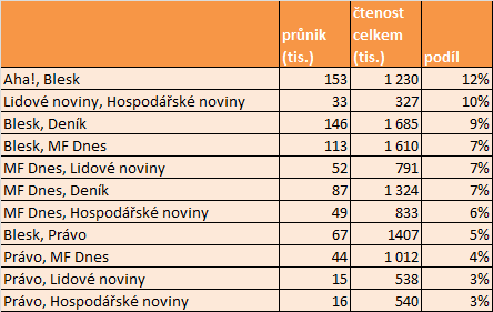Naopak nejnižší překryvy jsou u čtenářů deníků Lidové noviny a Právo, Hospodářské noviny a Právo a MF Dnes a Právo.