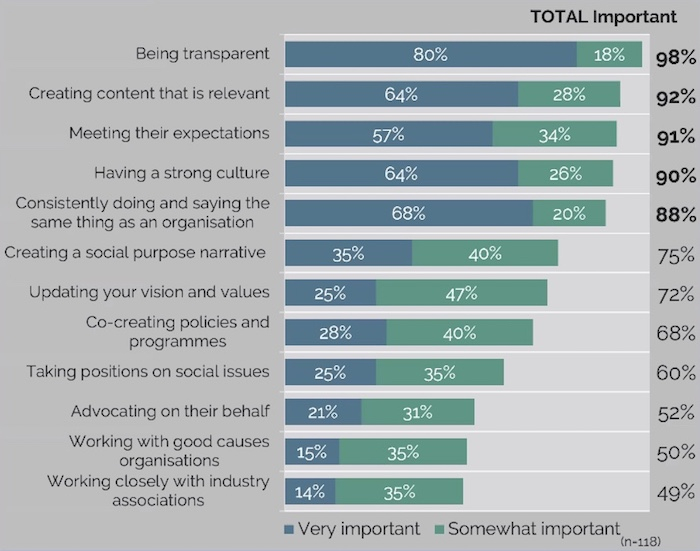 K důvěryhodnosti firmy jako takové ze všeho nejvíce přispívá podle respondentů transparentnost (98 %), relevantní obsah (92 %), splnění očekávání (91 %), silná firemní kultura (90 %) a konzistentnost komunikace (88 %).